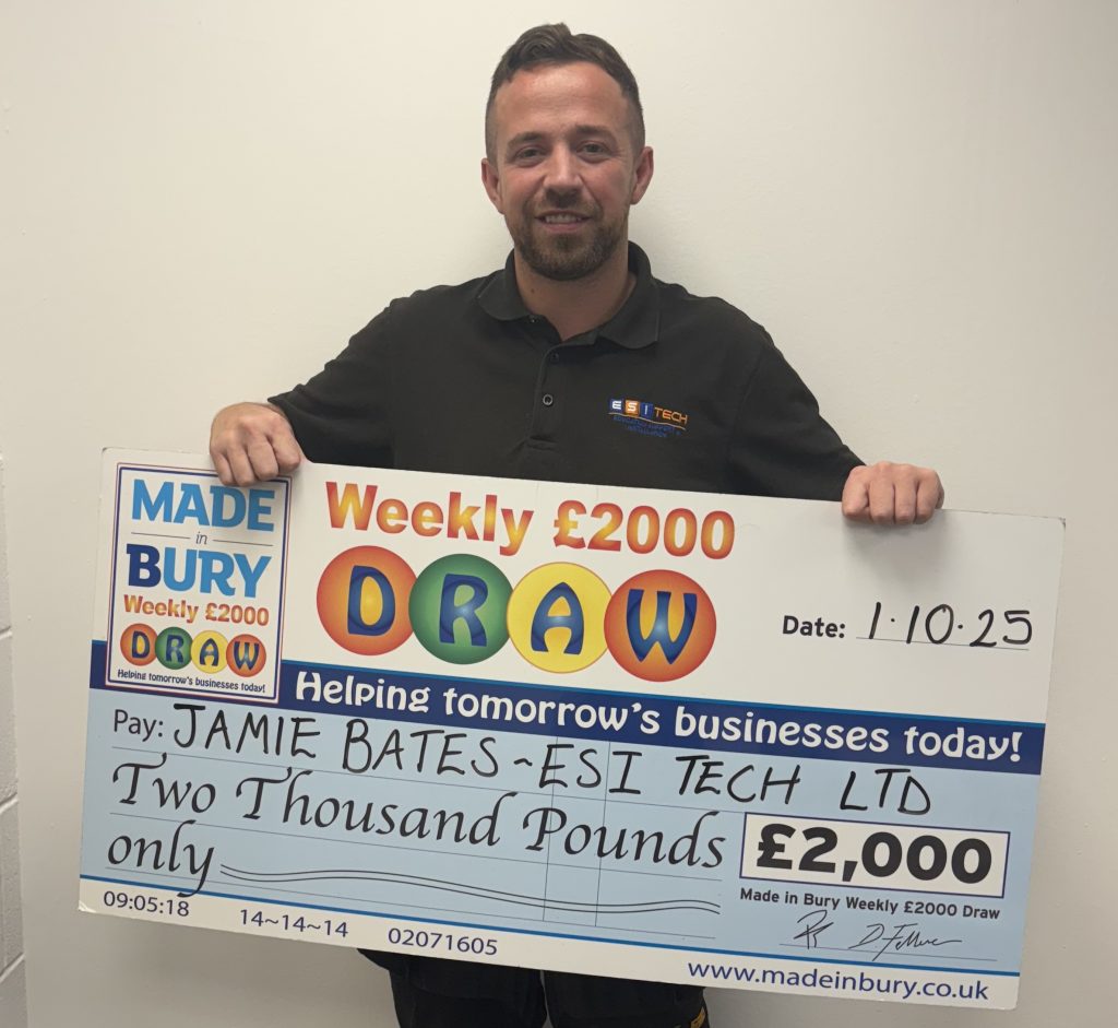 We’re delighted to announce that the winner of this week’s Made in Bury Weekly £2,000 Draw is Jamie Bates, with ticket number 22990. Jamie is the Managing Director of ESI TECH, based at BusinessLodge Bury, and this November he will celebrate 10 years in the role. As a very hands-on leader, Jamie oversees the day